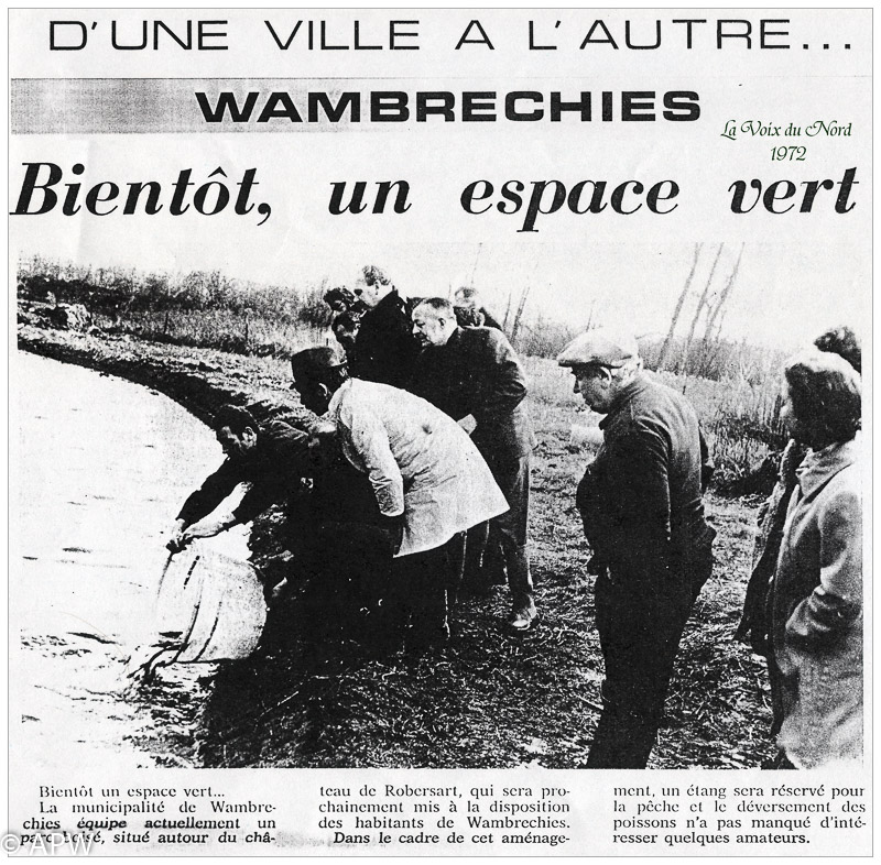 «Au début de l’année 1971, un habitant de Wambrechies nommé Maurice TOMASINA était au café de Marcel DES-LOOVER. Il lui proposa de fonder une association de pêche pour l’étang du parc, récemment acquis par la municipalité, un lieu parfait pour la pêche. Marcel accepta à condition que Maurice trouve un président fiable. Maurice enfourcha son vélo et se rendit chez Monsieur André ROUSSEAUX, adjoint au maire, qui accepta la proposition. Une première réunion fut alors organisée au café de Marcel.»